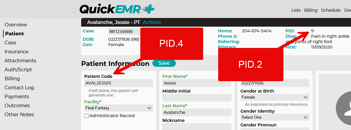 - Patient ID - The unique patient id from QuickEMR. (See PID.2, PID.4 Screenshot)