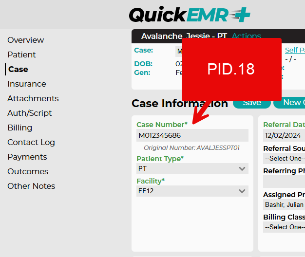 - Case Code - The unique code assigned to a patients episode of care. See Screenshot PID.18