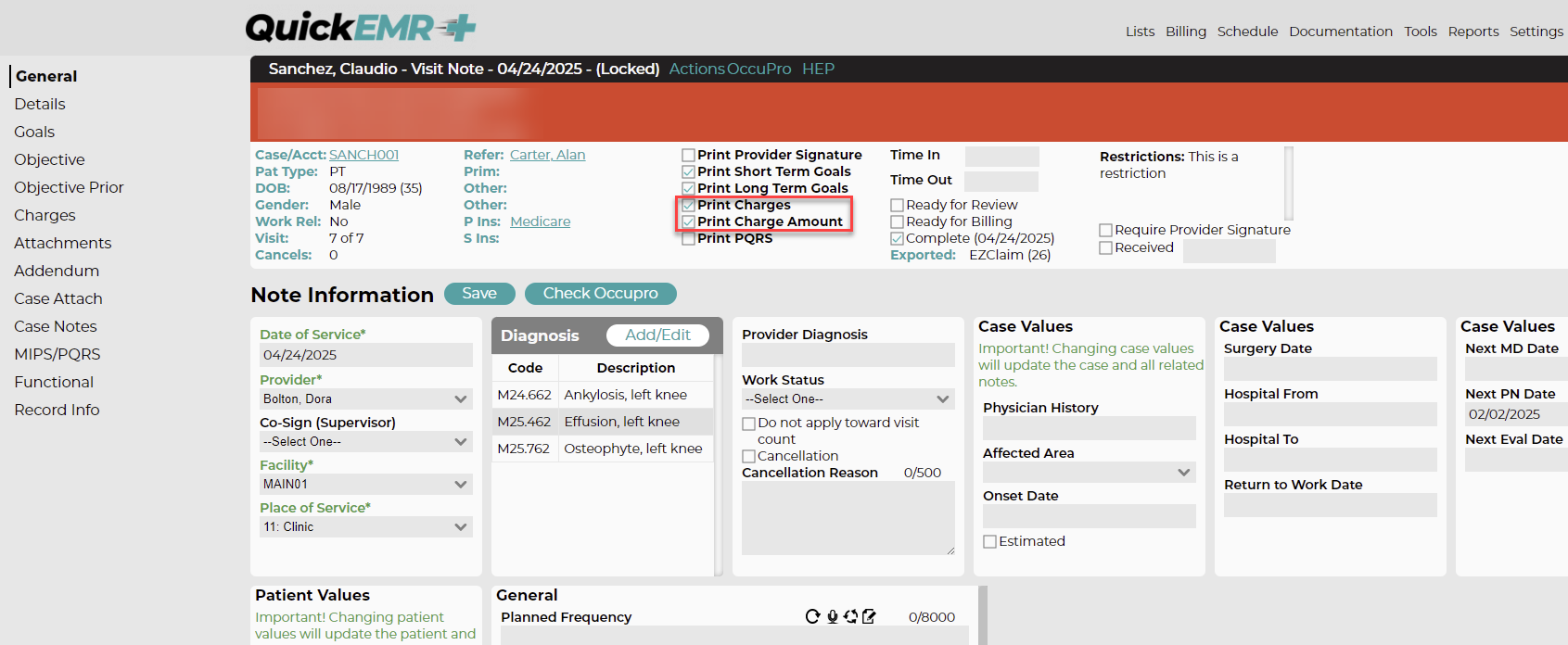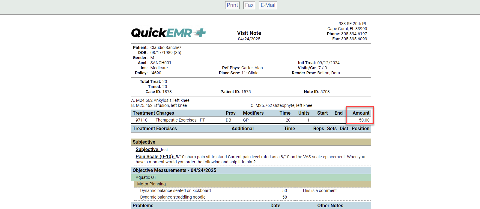 The correct associated charge amounts will then be display in the note printout under Actions --> Print.