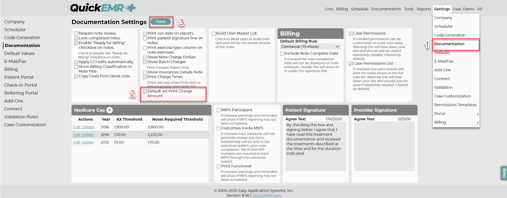 Under Settings --> Documentation, you will also notice a setting for "Default Set Print Charge Amount". This will auto-check the checkbox within the note upon the documentations creation to always show the charge amounts on the note printout. To change this, simply uncheck this box and press the Save button.