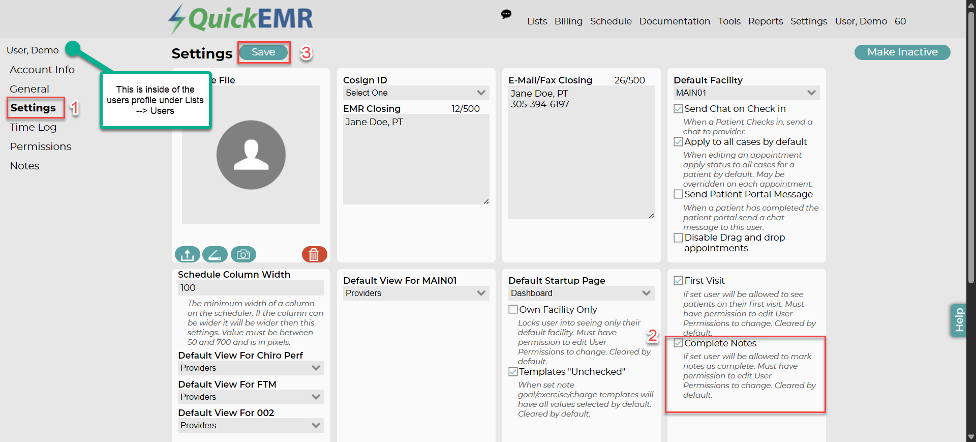 To allow a user to complete a note, the user must be given permission in the user settings.
