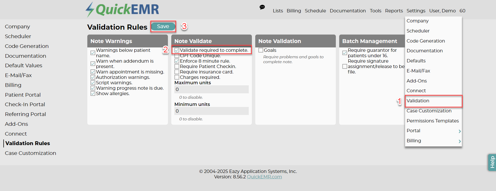 16. If Settings --> Validation Rules --> Note Validation --> Require Patient Check-in is set an appointment for the same day, patient, and assigned provider must exist and be set to a checked in status.
