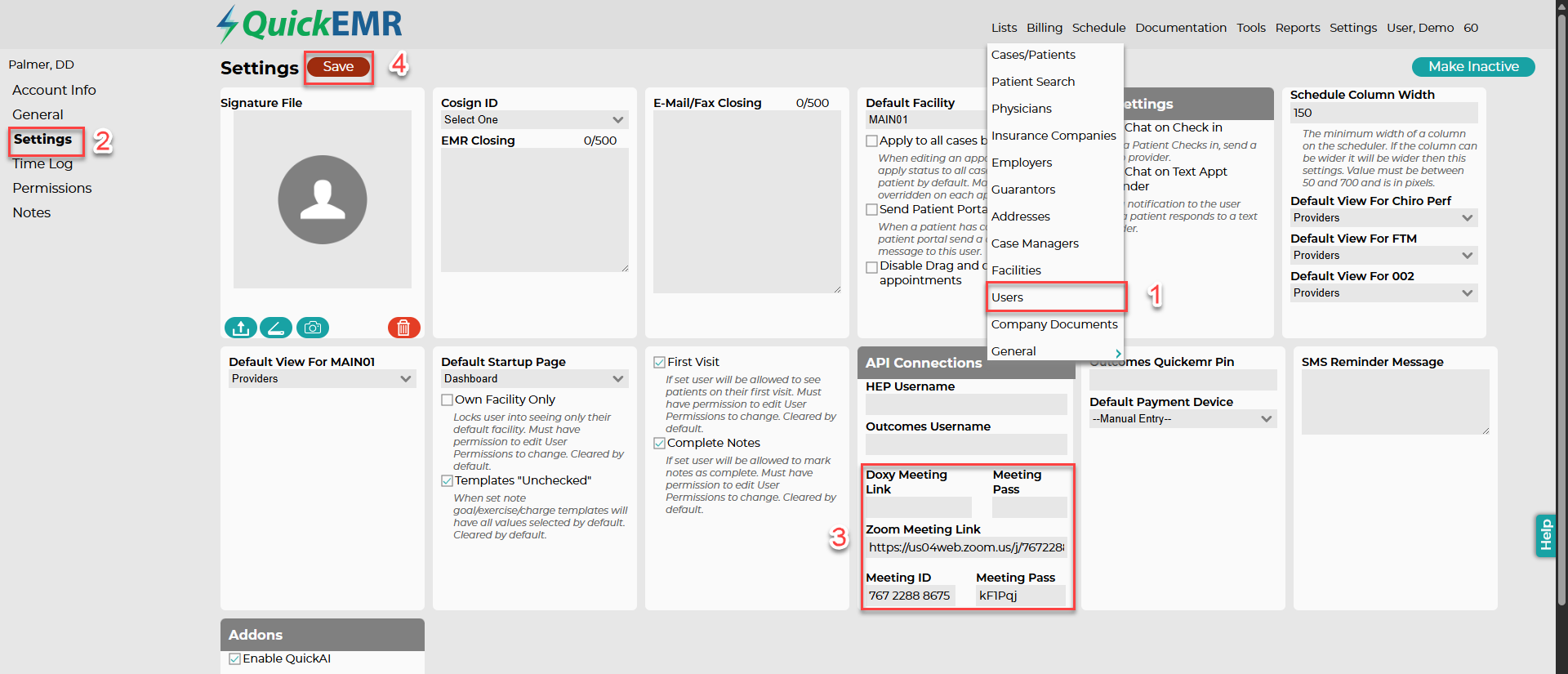 Once you have added your meeting information into your global settings, you will now need to enter the meeting information under the users that you would like to have the ability to meet with patients via Zoom or Doxy.