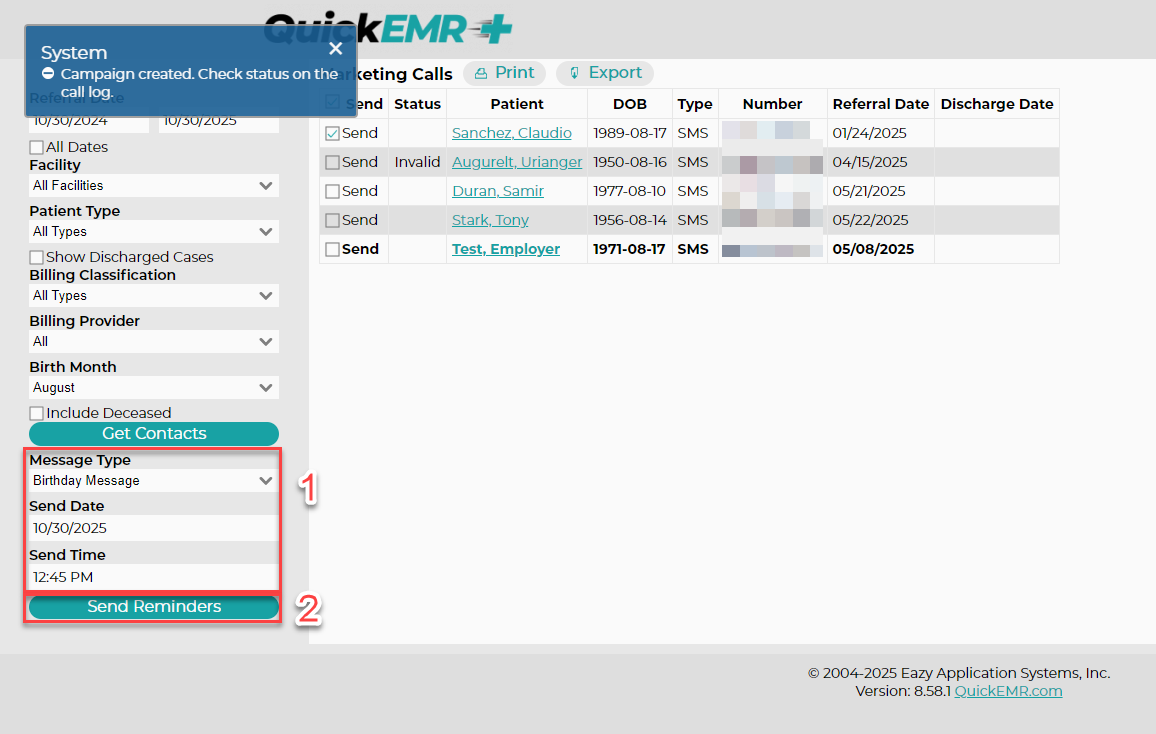 Once the report generates all of the patients within your specified search parameters, you will need to select the Message Type (The template that you previously created), Send Date, and Send Time. Then, once the message is ready to send, press Send Reminders. You will see a System message stating that the messages have successfully been sent and the Campaign has been created.