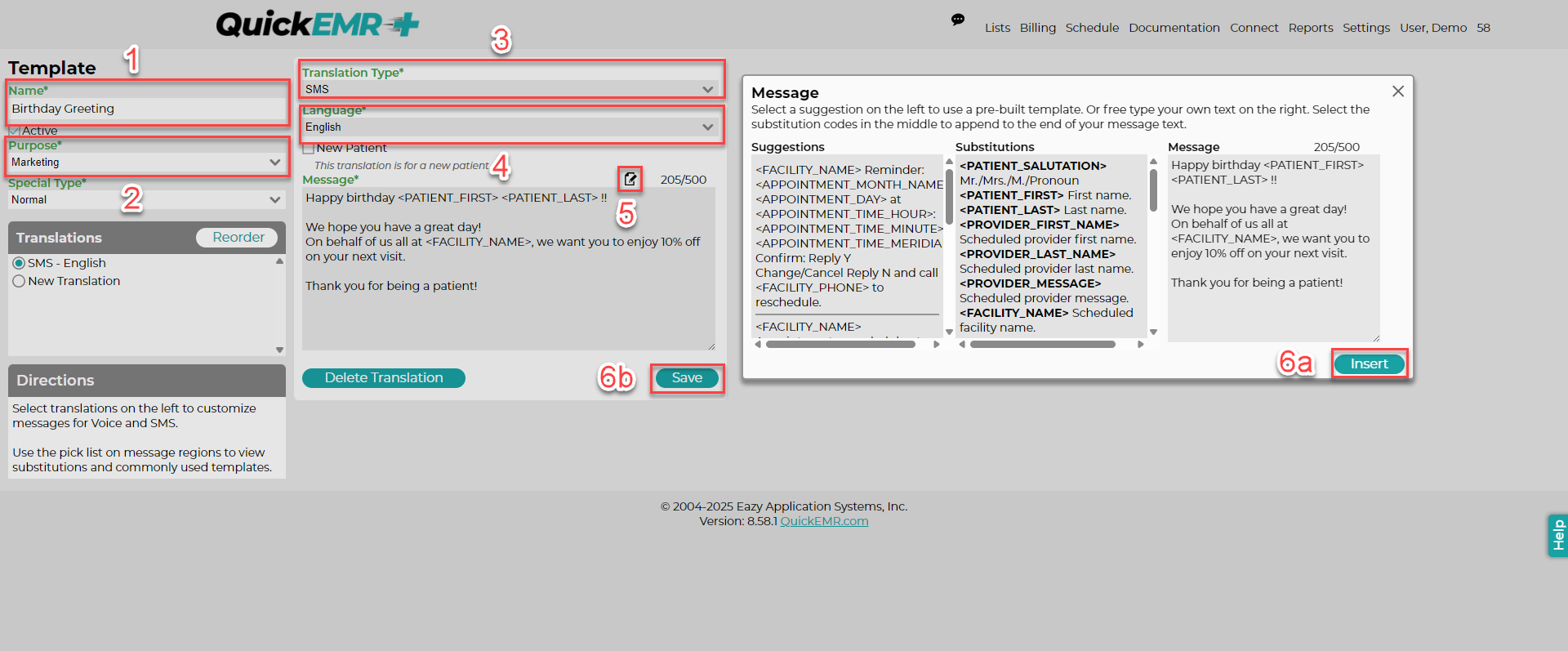 To send marketing text messages or phone calls through QuickEMR, you’ll first need to create a Message Template that contains the content you wish to send to patients. These templates can be customized for various purposes, such as practice updates, birthday greetings, holiday promotions, or other marketing communications you’d like to share.