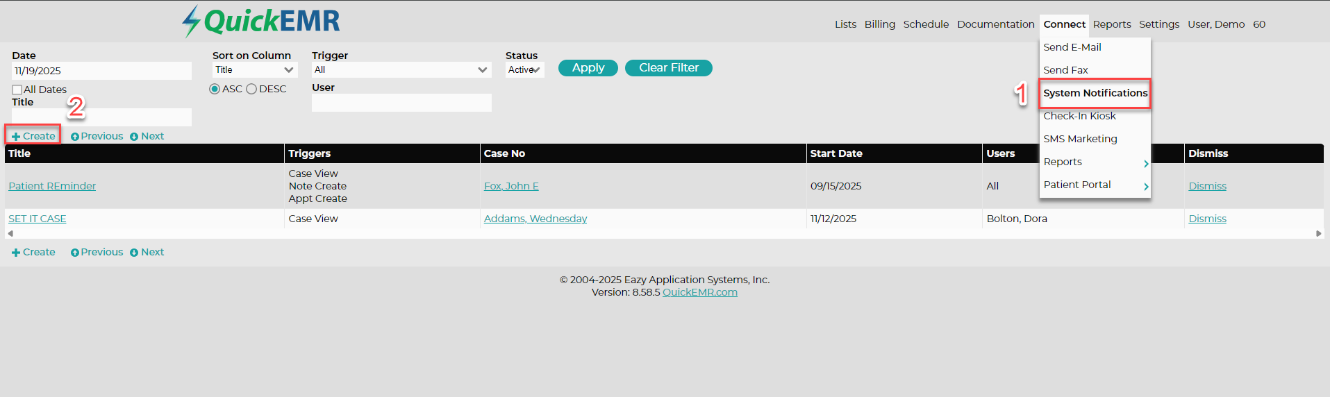 QuickEMR allows you to create system notifications that appear wherever you choose by configuring specific triggers. This feature helps you keep users informed of important details and ensures key information is not overlooked.