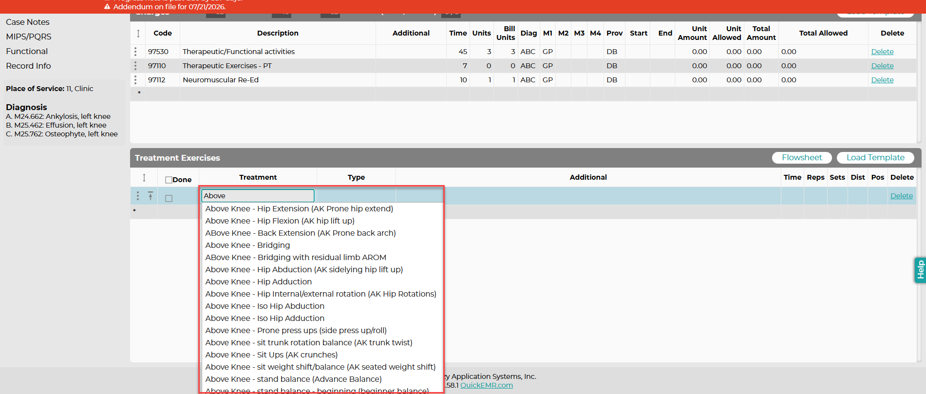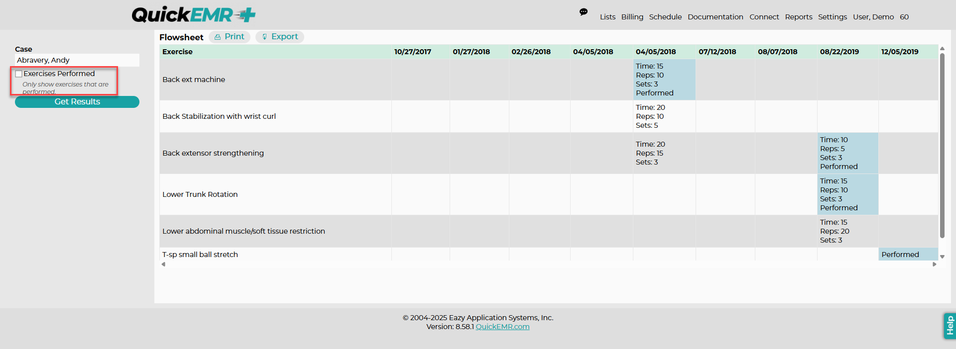 Within the Exercise box in the Charges tab, you can also create a flowsheet that includes all of the exercises for the patient since the beginning of their case visits.