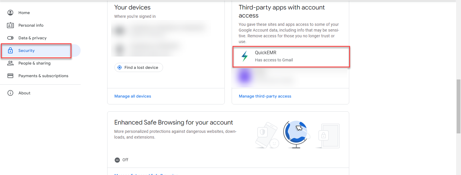 2. Go into their gmail security settings and ensure that access has been removed from Quickemr